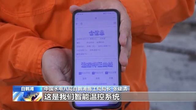 中国水电八局白鹤滩施工局局长 张建清:这是我们智能温控系统,及时把仓面的温度和冷却水管的温度反映到我们后台平台上以后,通过预先设定的温控策略,然后对通水温度以及通水的流量进行调整,确保混凝土内部最高温度和降温速度完全按设定目标进行,做到分毫不差。