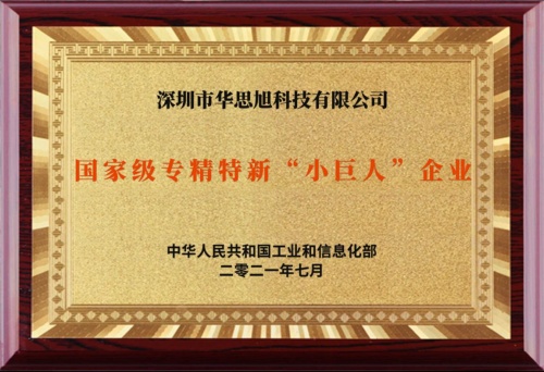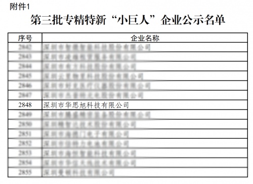 2021年7月19日,中华人民共和国工业和信息化部中小企业局公示第三批专精特新“小巨人”企业认定名单,深圳市华思旭科技有限公司凭借创新的技术、产品及市场优势被认定为第三批专精特新“小巨人”企业。