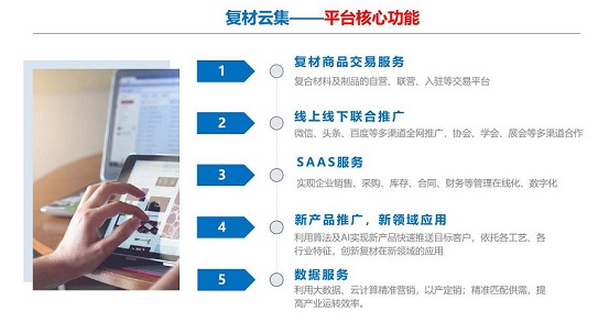 除了产品质量以外,企业想要获得成功也得找对销路,拓宽销路。在互联网时代中,与线下销售相比,线上销售会更加方便快捷。但是,这正是我国传统企业的短板之一,我国有不少的企业是老牌企业,这些老牌企业在线下销售方面很突出,但是线上销售则有些不足。而年轻的企业则很难短时间内打开销路,消费者很难了解到它们,销路不通。而平台+企业的方式则能有效地补足这一短板,能让优良企业出名出众,也能为每一个企业提供精准的定位打开销路。复材云集涉及方面极其广泛,复材云集涉及有增强材料碳纤、玻纤,有不饱和聚酯树脂、环氧树脂等各种树脂材料,还有高分子等材料领域,在新能源汽车、航天和医疗等各种器材亦有着广泛的领域涉及,同时在风电、太阳能等能源领域也有涉及到,涉及范围领域极为广泛。无论消费者需要怎样的材料都可以在复材云集找到,能给消费者推荐更高性能的材料。而企业和商家也可以入驻复材云集。复材云集可以帮助企业进行产品推广、客户对接、技术支持等方面,让企业用最少时间、钱与互联网相连。目前,复材云集平台活跃能达到300+,日成交额在百万左右,极大地让入驻平台的企业和商家的日销售额明显增加了。复材云集之所以能够成长为如今优良的平台,离不开对时政的精准把握。复材云集正在向着数字化、在线化、智能化方向发展,用直观的数字来展现产品的性能和外观,让消费者可以精准地找到自己需要的东西,也为消费者提供贴心服务。