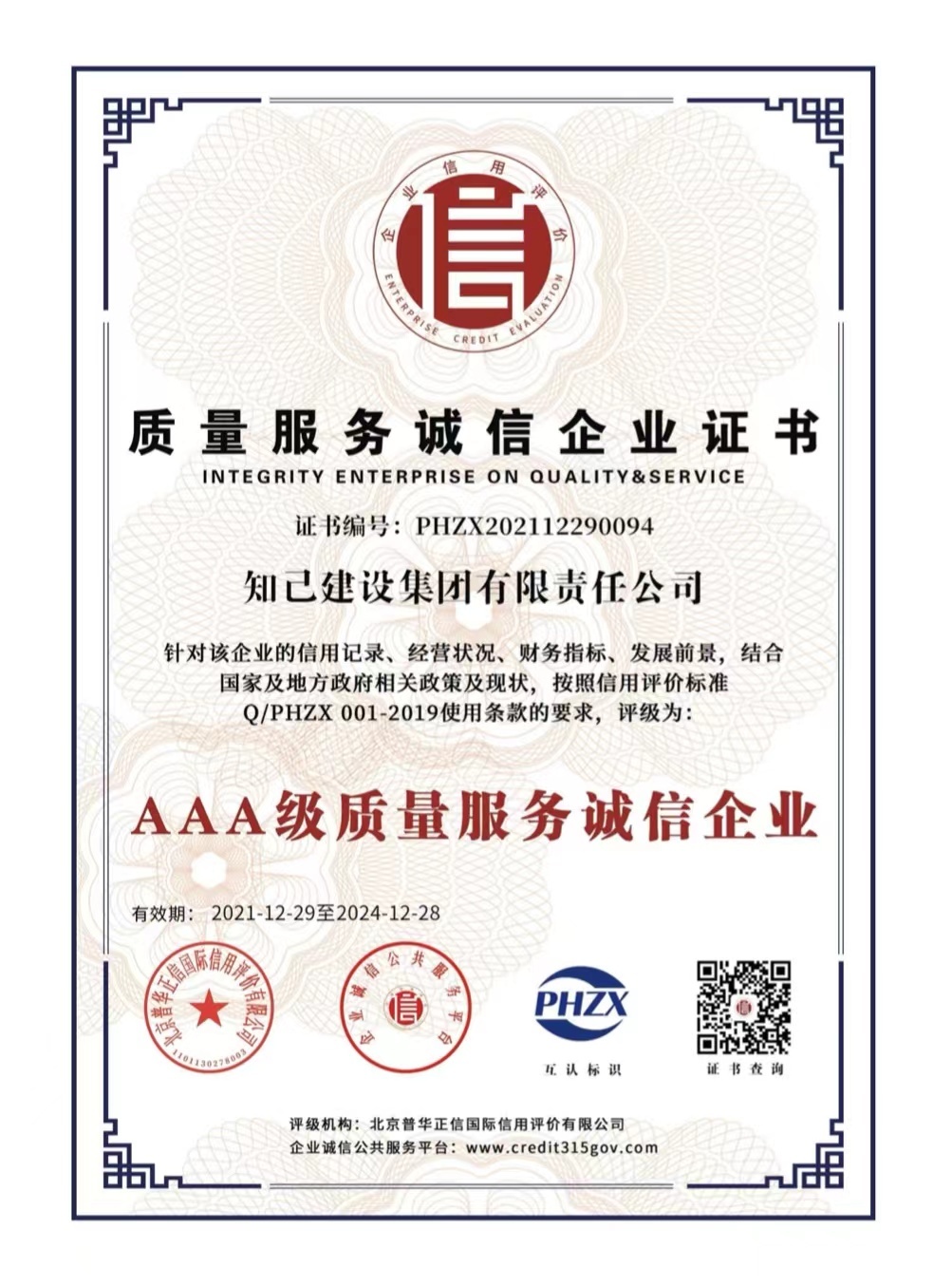 近日,知己建设集团有限责任公司完成了企业信用评级工作,被全国企业诚信公共服务平台、北京普华征信国际信用评价有限公司评为“AAA级信用企业”“AAA级诚信经营示范单位”“AAA级质量服务诚信企业”“AAA级重合同守信用企业”“AAA级诚信供应商”、立信单位“AAA级”、企业资信“AAA级”。同时,知己集团董事长贲智群被评为“诚信企业家”并获得荣誉证书。