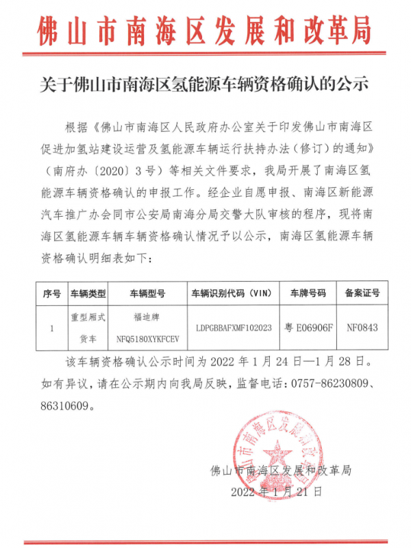 1月21日,根据《佛山市南海区人民政府办公室关于印发佛山市南海区促进加氢站建设运营与氢能源车辆运行扶持办法(修订)的通知》(南府办【2020】3号)等相关文件,南海区发改局开展了南海区氢能源车辆资格确认的申报工作。经企业资源申报、南海区新能源汽车推广办会同***局南海分局***大队审核的程序,佛山市南海区人民政府发布了新一批氢能源车辆资格确认的公示,本次公示车只有一辆,车辆型号为广东福迪汽车有限公司的NFQ5180XYKFCEV,该款车型已于今年登录工信部推荐目录。