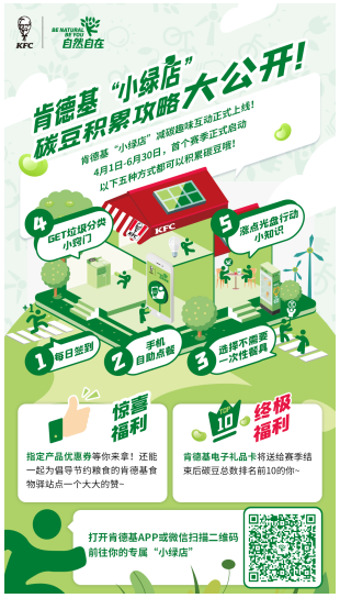 肯德基 “小绿店”在2022年4月于线上线下同时推出,以“绿色减碳”为纽带联动数字世界与现实生活,相辅相成,创新践行肯德基“自然自在”可持续发展理念,也从多维度带动消费者节能减碳的生活方式,和肯德基一起自然自在。