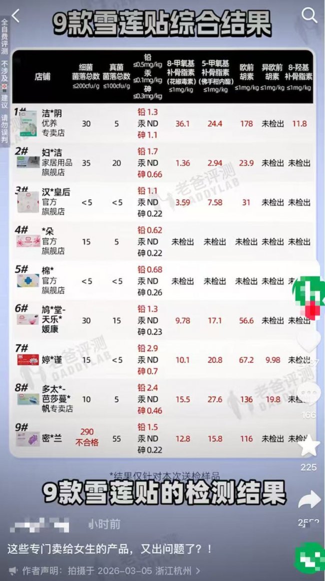 近日, “老爸评测”发布视频揭露了市面上 9 款雪莲贴产品的质量问题。经检测,这些产品分别存在细菌菌落总数不合格、重金属含量超标,以及检出呋喃香豆素类化合物(禁用致癌物)等严重安全隐患。