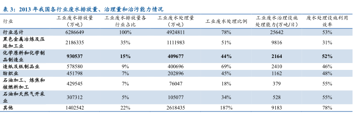 从行业统计上来看,我国2013年废水排放总量为629亿吨,其中黑色金属冶炼及压延加工业排放量最大218.6亿吨,占35%,其次是化学原料和化学制品制造业93亿吨,占15%。