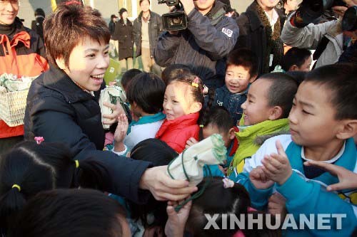 2007年12月4日 邓亚萍变身“节能大使” 12月4日,邓亚萍为小学生发放节能灯。