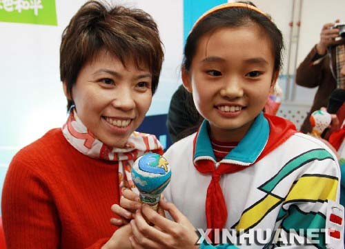 北京,2007年12月4日 邓亚萍变身“节能大使” 12月4日,邓亚萍(左)和一名小学生共同展示用废旧白炽灯制成的作品。 当日,北京奥组委奥运村部副部长、前乒乓球世界冠军邓亚萍以“绿色和平节能灯”项目代言人的身份,为西城区鸦儿胡同小学送去节能灯,呼吁公众以节能灯替换白炽灯。 新华社发(闻昭 摄)