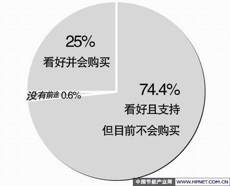 其实,新能源汽车的概念提出已经很长时间了,但是平时在街头却很难见其踪迹。通过本次的调查,几乎所有的接受调查人员都表示,看好新能源汽车的前景并且坚决支持新能源汽车的发展。记者从调查数据中得到印证,74.4%的人表示,新能源汽车环保、节能,自己看好并且支持新能源汽车的发展,但是目前不会购买;还有25%的人表示,看好并且会购买新能源汽车;只有0.6%的被调查者认为新能源汽车没有前途。记者从全国乘用车信息联席会统计数据看到,2008年,普锐斯最终仅销售899辆,没有完成1000辆的年销售目标。自2006年进入中国市场三年以来,普锐斯累计销量不足3500辆。由此可以看出,新能源车虽然被大众看好,但是销售情况却一般。