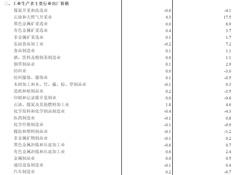 工业生产者出厂价格中,生产资料价格环比持平。其中,采掘工业价格上涨0.8%,原材料工业价格上涨0.3%,加工工业价格下降0.1%。生活资料价格环比持平。其中,食品和衣着价格均持平,一般日用品和耐用消费品价格均下降0.1%。