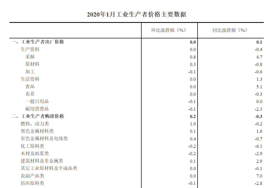 :2020年1月份,全国工业生产者出厂价格同比上涨0.1%,环比持平;工业生产者购进价格同比下降0.3%,环比上涨0.2%。