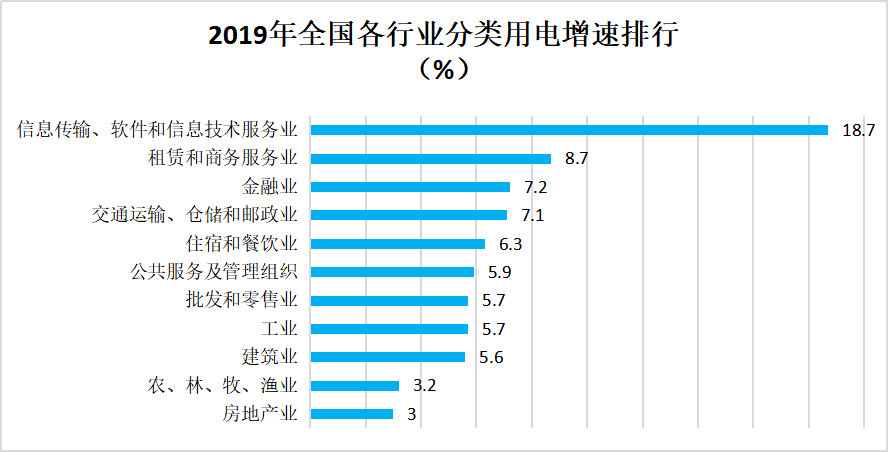 由上图可见,2019年全国信息传输、软件和信息技术服务业的用电增速最高,达18.7%,而房地产业用电增速最低,仅3%。