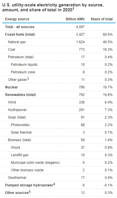 据美国能源信息署(EIA)统计,2020年,美国仍有60%以上的电力来自化石燃料发电,其中,40%为天然气发电,20%为煤炭。