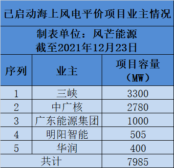 在这12个项目中,三峡、中广核、广东发展集团总项目容量均超1GW。