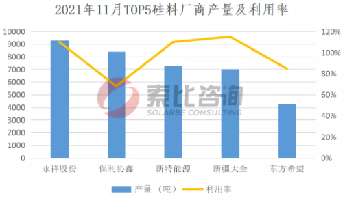 2021年11月,国内12家多晶硅企业在产。虽然“双控”政策仍有影响,但永祥、协鑫、新特、大全等头部企业产量有所增长,因此本月产量基本与10月持平。11月份国内多晶硅产量为4.21万吨(约16.63),环比增长0.2%。按照产量排名,永祥、协鑫、新特、大全、东方希望位列前五,企业总产量3.63万吨,占比86.2%,综合利用率95.2%。