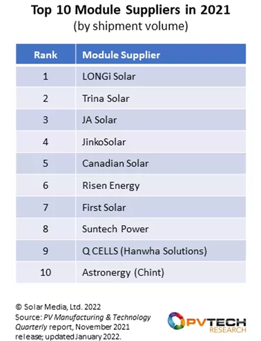 据PV-Tech介绍,2021年全球光伏行业实现跨越式发展,光伏行业整体产能和出货量均超过 190GW,与PV-Tech2020 年底对 2021 年预测高度一致。出货量排名预测结果主要基于持续跟踪各家组件企业全年的产能和出货量而得出。2021年全球前 10 名组件供应商出货量具体排名如下: