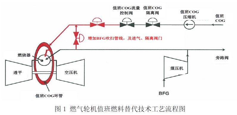 该技术通过对燃气轮机燃烧室流体预混、扩散燃烧进行研究,建立燃烧计算模型,模拟燃烧室工况,调整过量空气系数,按《燃气轮机排放标准》计算燃料更改后燃烧室燃烧温度,确保最佳过量空气系数,降低燃烧温度以及NOX、SO2的生成量;同时,通过焦炉煤气(COG)及高炉煤气(BFG)联动逻辑系统研究,将值班燃料切换过程中及切换后的燃烧波动偏差控制在合理范围之内,实现对热值范围的相应修改,增强燃气轮机对燃料的适应性,增加高炉煤气用量,提高联合循环发电机组出力。在极限工况下,如燃气轮机负荷小于5MW,热值低于2990kJ/Nm3-wet,大气温度低于-12℃等情况下,需增加相应保护连锁,防止回火、熄火等事故发生,保证安全运行。