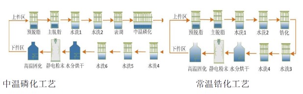 预脱脂→脱脂→水洗→水洗→表调→中温磷化(需加热)→封闭→水洗→水洗→水洗→水洗→干燥;