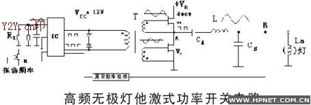 图(3)是设计成IC驱动的他激式高频无极灯功率开关电子镇流器的主电路,由IC及外部组件产生设定的工作频率(2.65MHz),可变电阻可作频率微调。该电路还设定了过渡时间的调节,使开关管的热损耗大大降低。